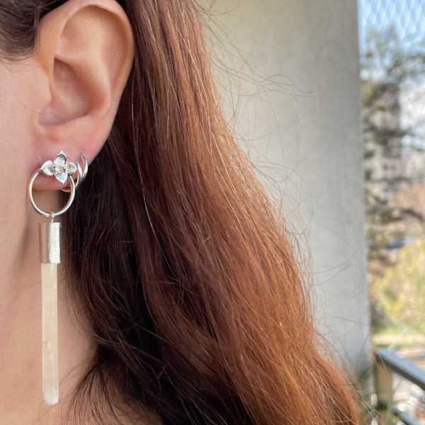 Aros de plata fina 950, con flor y cuarzo cristal natural (irregular, no pulida).
