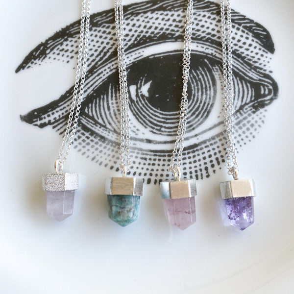Mini puntas de Amatista, Cuarzo rosa, Amazonita con plata 950, terminación texturizada y diamantada.