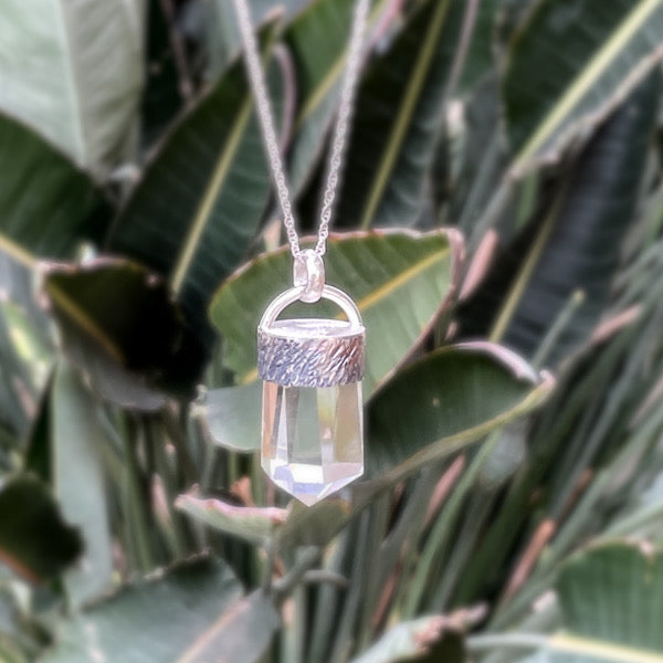 Punta de cuarzo cristal con plata 950 con terminación texturizada envejecido