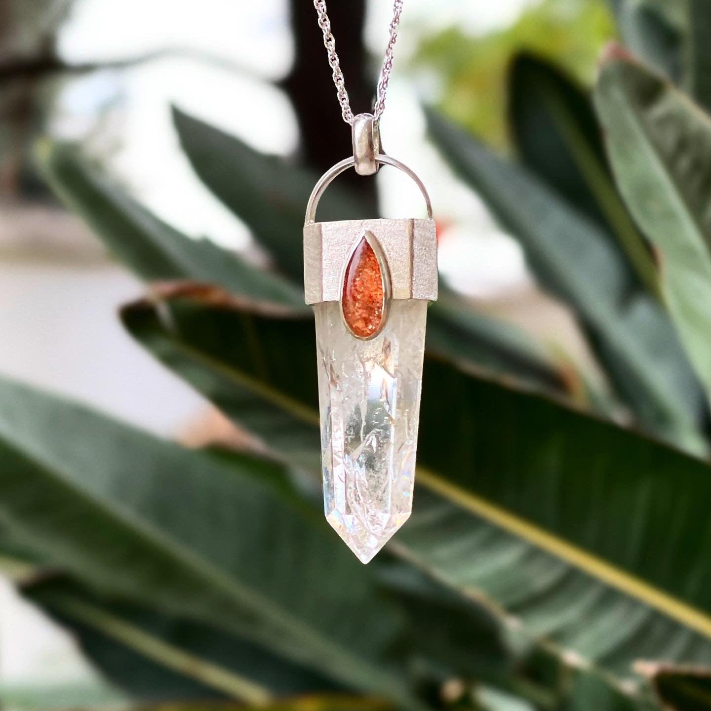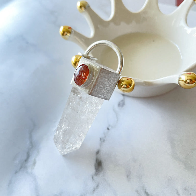 Punta de cuarzo hielo con plata 950 con terminación texturizada con piedra del sol ovalada.